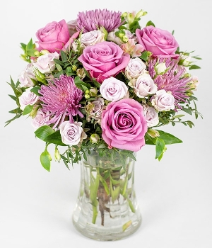 A pretty pink and lilac bouquet feauturing roses, chrysanthemums, and alstroemeria, surrounded by mixed seasonal foliage.