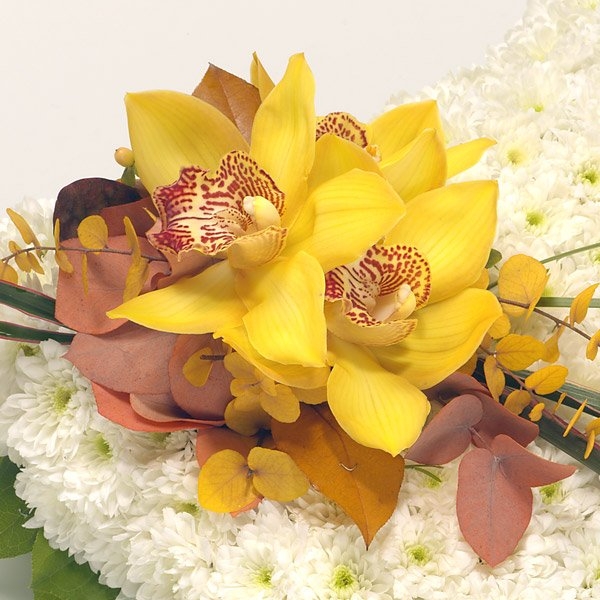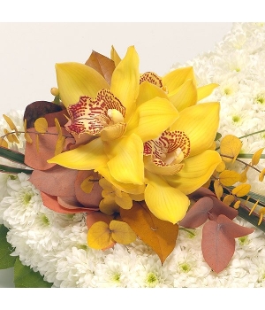 A classic white based cushion design with orange & yellow spray & foliage edge