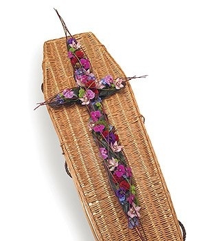 Loose cross of pink and lilac flowers with willow and mixed foliage