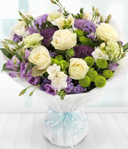 This hand-crafted bouquet contains a mix of white Roses and Freesias with lilac Lisianthus and Trachelium, coupled with lavender Statis, green Spray Chrysanthemums and Carnations.